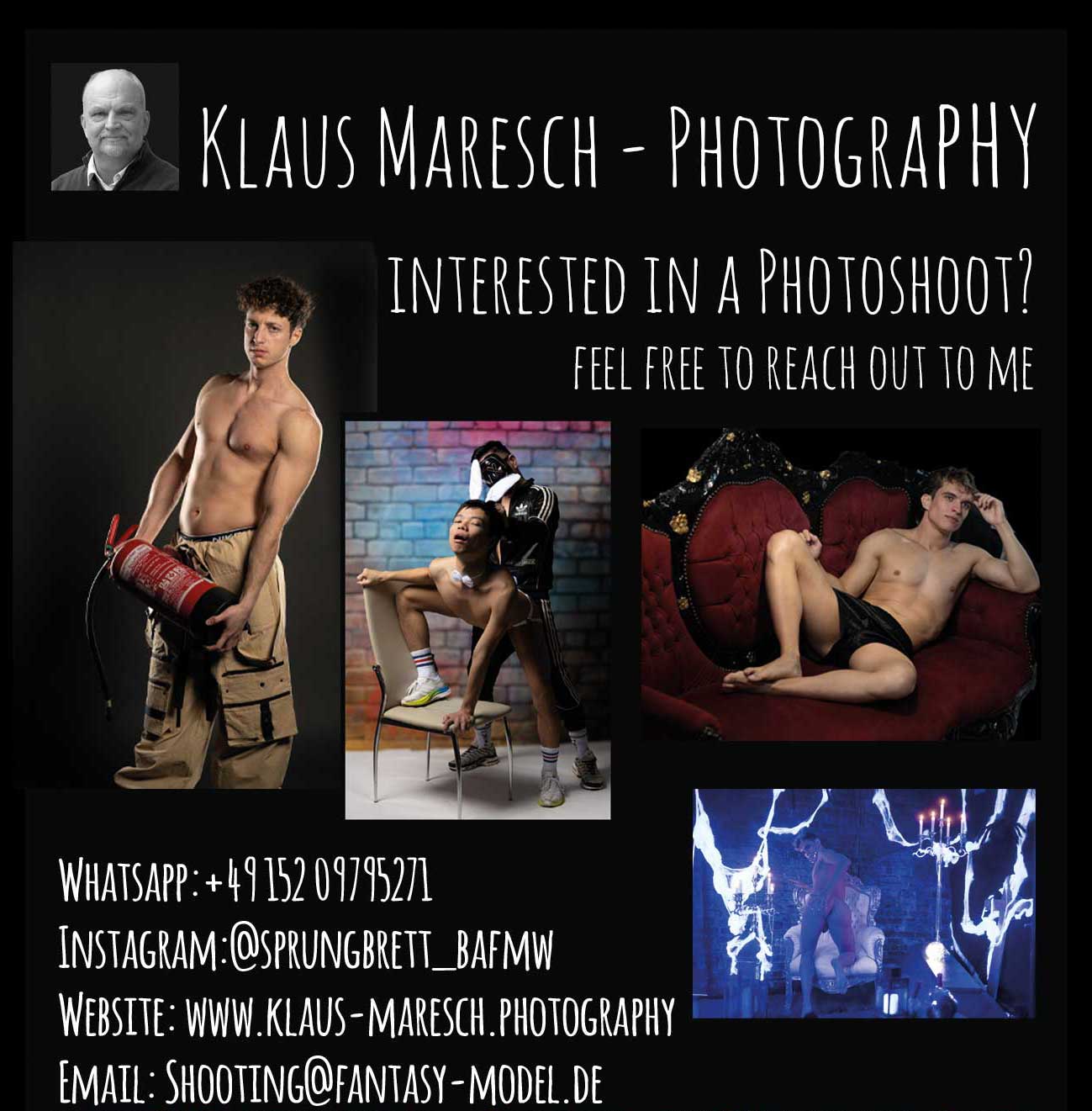 In dieser Woche lade ich Creator, Models und Performer zu Fotoshootings ein, die gezielt auf hochwertigen Content für Fanplattformen, Social Media und Portfolios ausgerichtet sind. Mein fotografischer Fokus liegt auf einer positiven, ästhetischen Inszenierung von verführerischer Erotik und attraktiver Maskulinität – sinnlich, selbstbewusst und immer mit Blick auf Unterhaltung und Wirkung beim Publikum.